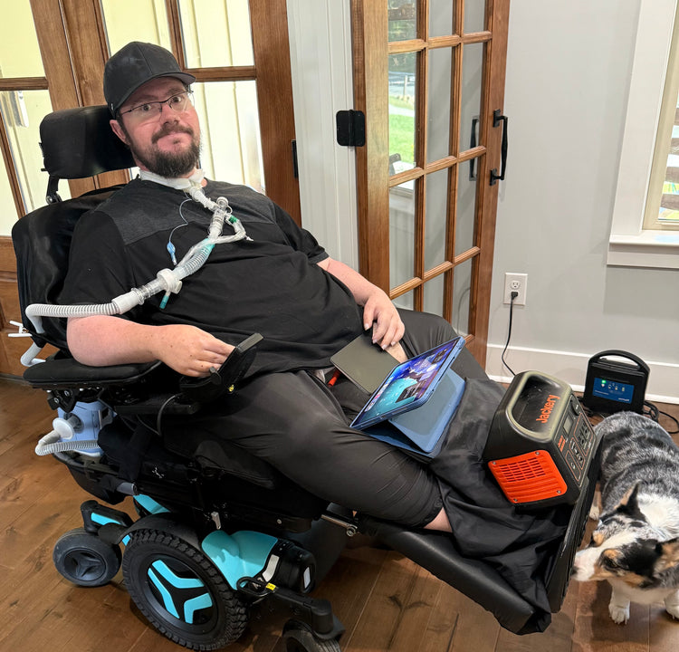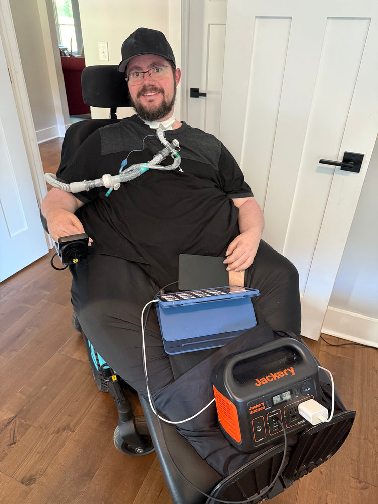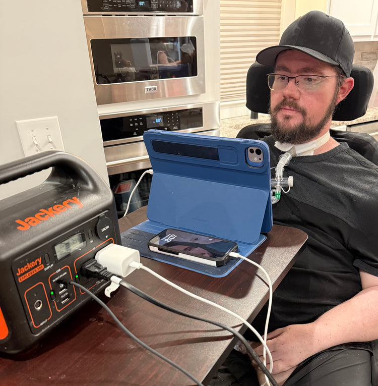 Tye’s daily routine is tightly interwoven with technology. An iPad holds his world: work calls, podcast interviews, medical appointments, family chats, and moments of entertainment. A portable ventilator hums quietly in the background, supporting him throughout his day. He is able to plug in multiple devices throughout the day, often stretching beyond the reach of wall outlets. Jackery sits nearby—a vital presence that enables him to stay flexible and be at peace knowing that he has energy wherever he moves. Whether it’s charging a mouse pad, powering a hotspot during a rural outage, or keeping the ventilator running during long van rides, Jackery has become the partner in Tye’s independence.