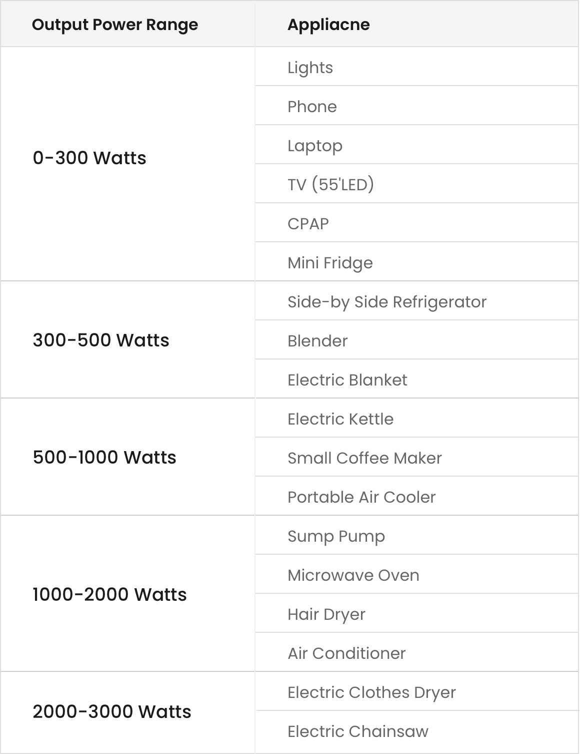 Note: These power ranges are typical for common appliances, but the actual power consumption can vary based on the specific model and its intended use.