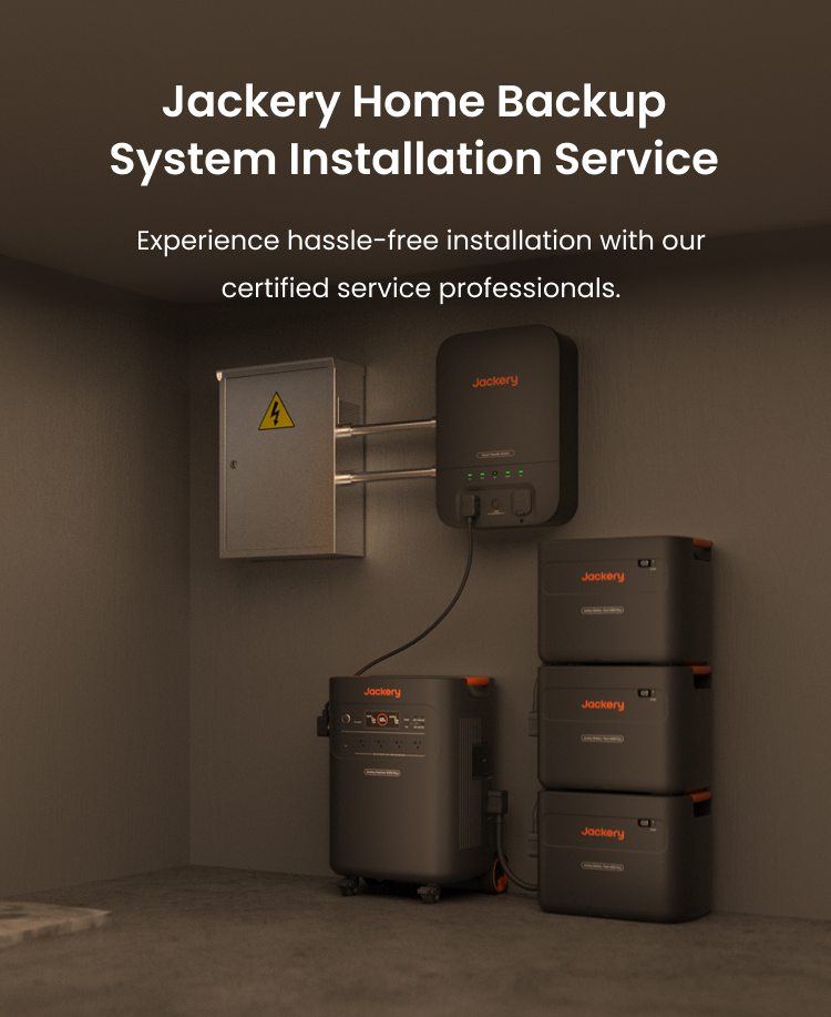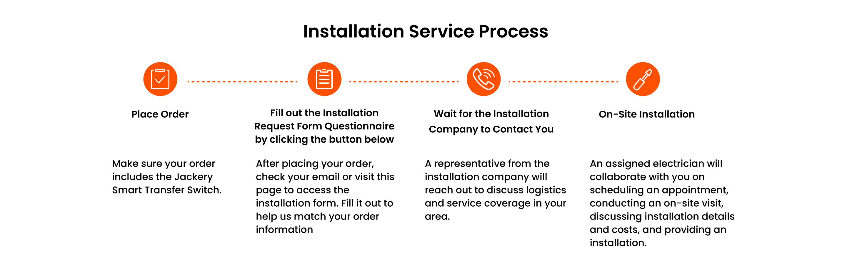 If you purchase Jackery Essential Home Backup bundled with a Jackery Transfer Switch and prefer to use Jackery's installation service, please complete the Jackery Installation Request Form. Jackery or the third-party installation company will contact you to confirm service coverage andarrange the installation. If you prefer to use your own electrician, handle the Jackery Transfer Switch installation yourself (if you are certified), you may do so at your own expense. Please refer to the Jackery Transfer Switch User Guide and installation videos available on our website.