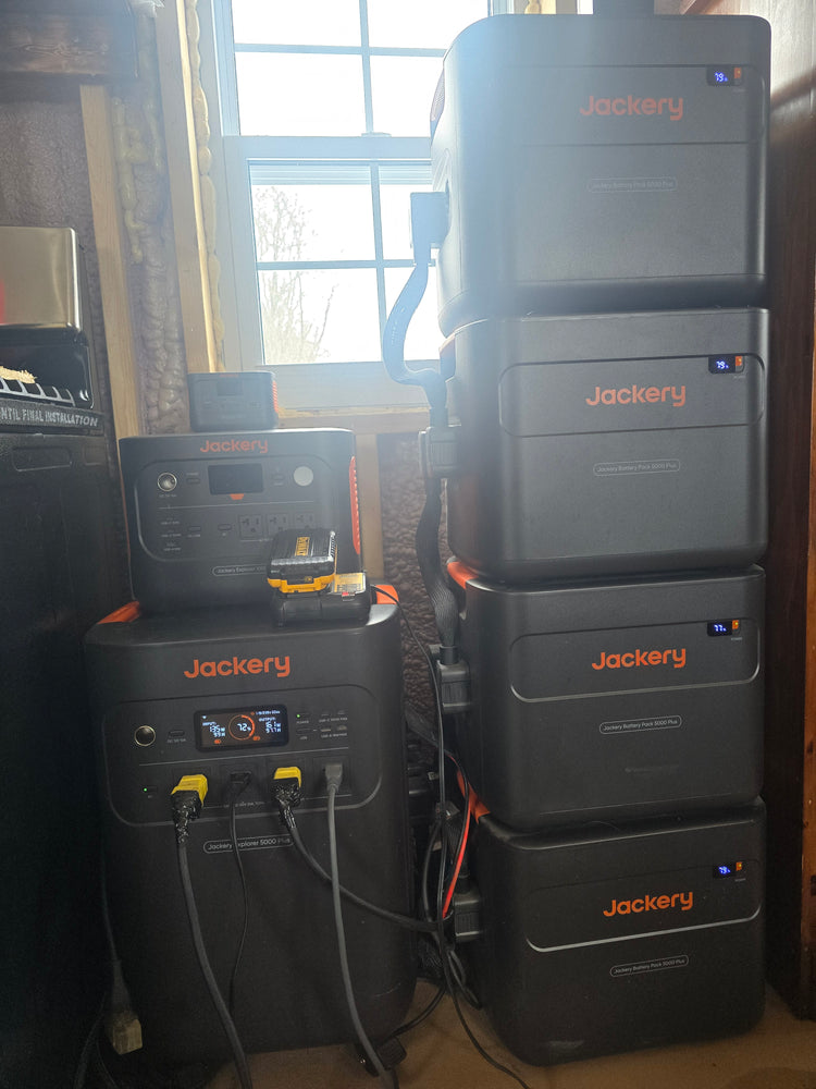 Today, James owns two Jackery Explorer 5000 Plus systems, four expansion batteries, and several Jackery Explorer 1000 for backup. One 5000 runs the household; the other powers the main circuits. “It literally runs everything,” he says. “Fridge, freezer, gaming PC, laptops, heater, TV, water pump.”