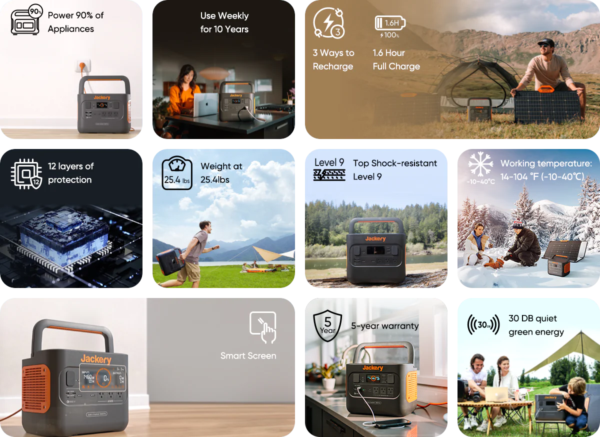 Jackery Explorer 1000 Pro can support 90% of your daily used appliances, from mobile phones to refrigerators, and even pumps; this solar charging power station can easily cover them all. The Explorer 1000 Pro delivers immense solar power - from RV trips to home emergency back up.