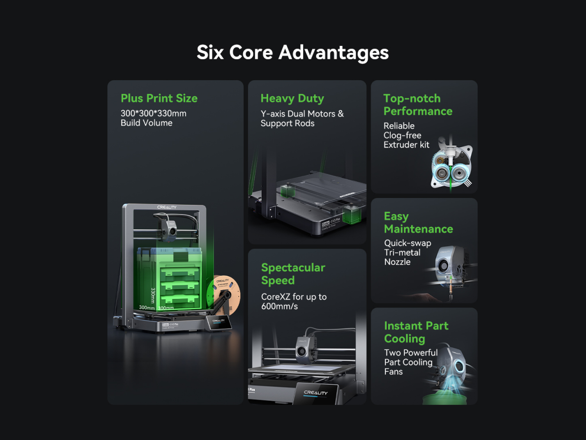 300*300*330mm build space, 58% larger than Ender 3 V3, enabling bigger prints and more efficient batch printing.