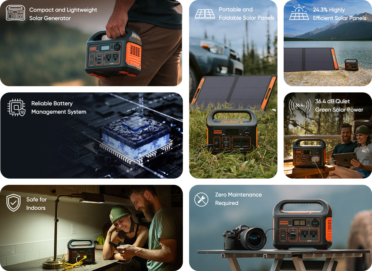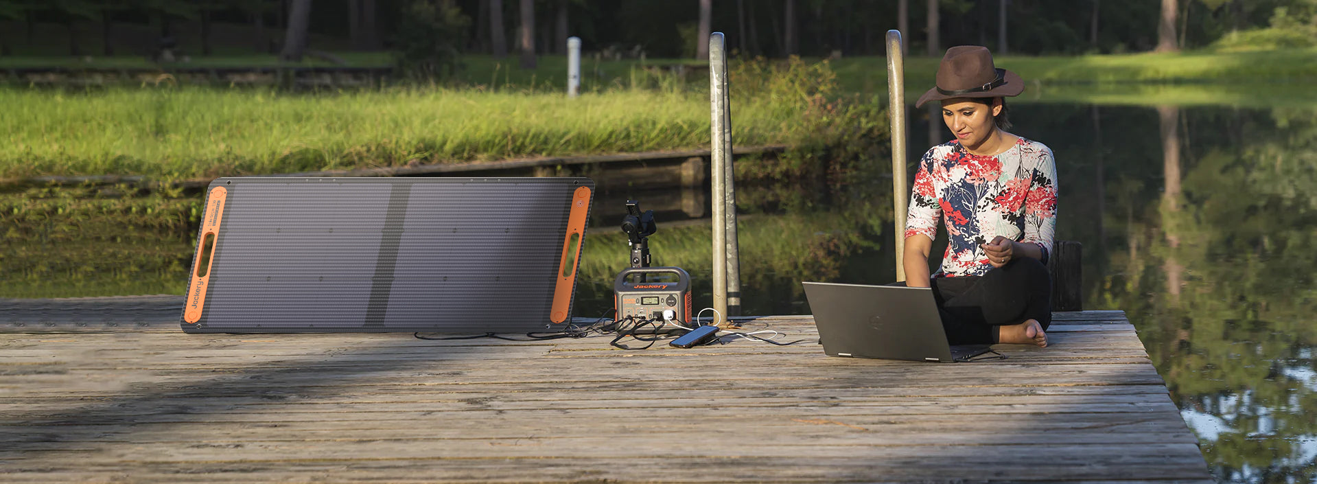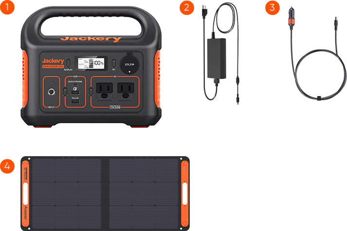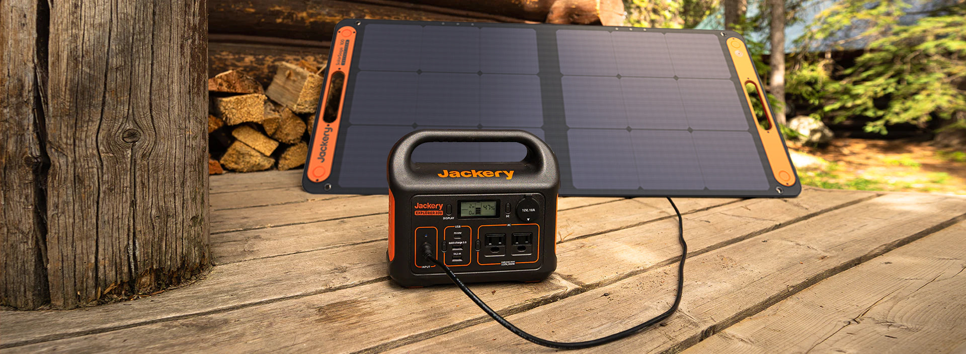 Jackery Solar Generator 300 combines Explorer 300 Portable Power Station and SolarSaga 100W and is suitable for RV, camping, and other outdoor activities. The solar panels absorb the sun's energy to convert it into electricity, which is then stored in a portable power station. It can run most of your personal electrical appliances, including a laptop, drone, mini cooler, and digital cameras.