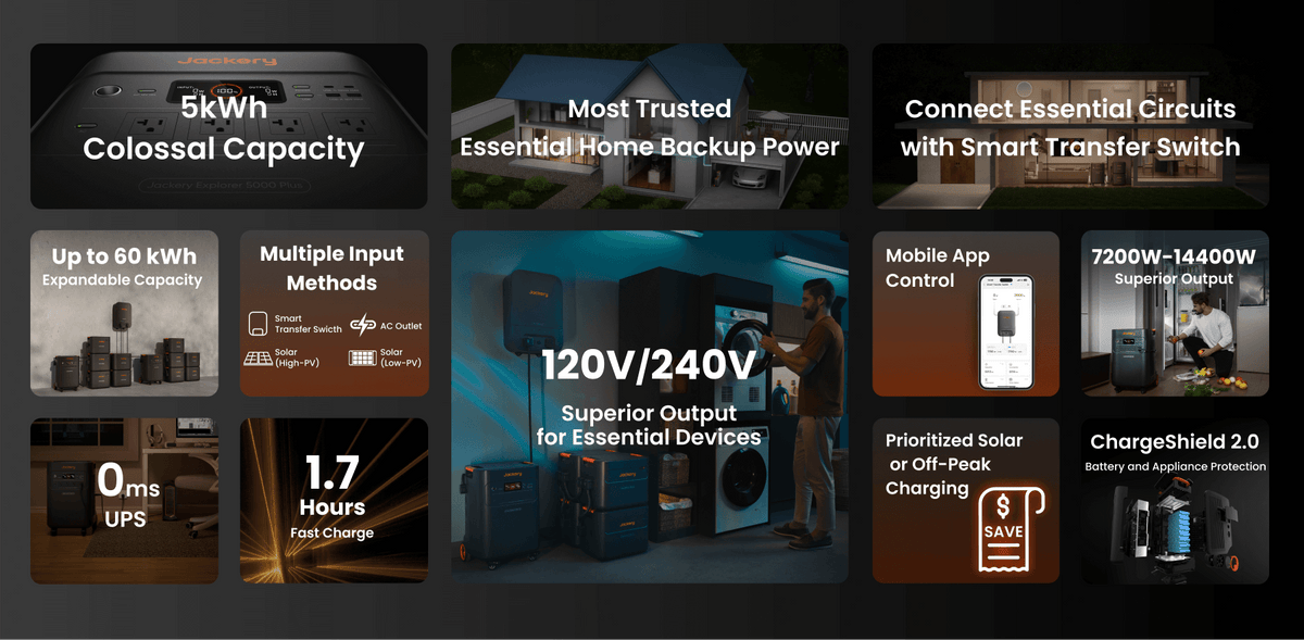 Jackery Explorer 5000 Plus offers eco-friendly home backup with 5-60kWh capacity and dual voltage output (120V/240V). It can power multiple appliances during outages with 12 output ports, 7200-14400W output, and a 0ms UPS seamless switchover for essential devices like fridges, computers, and routers. Connecting your essential circuits via the Smart Transfer Switch will also allow you to power your rooms seamlessly during an emergency. Smart app control and multiple charging options add convenience, while its zero-emission design ensures safe indoor use.