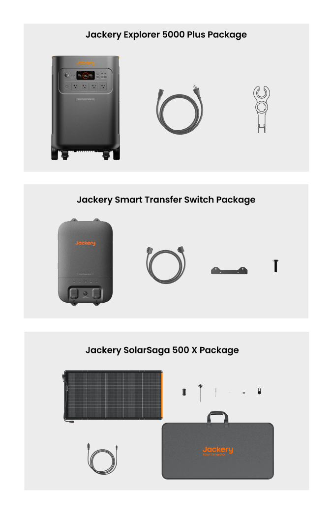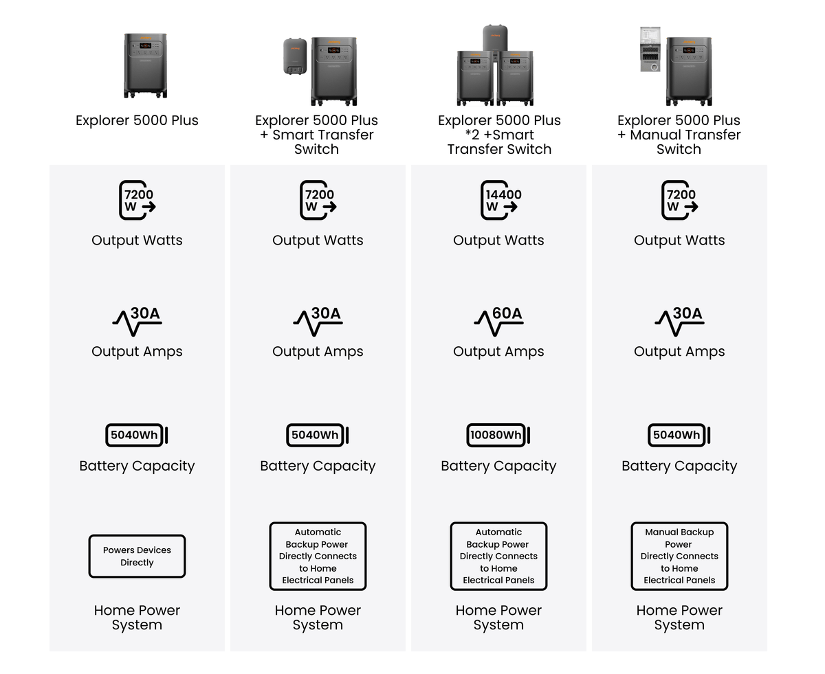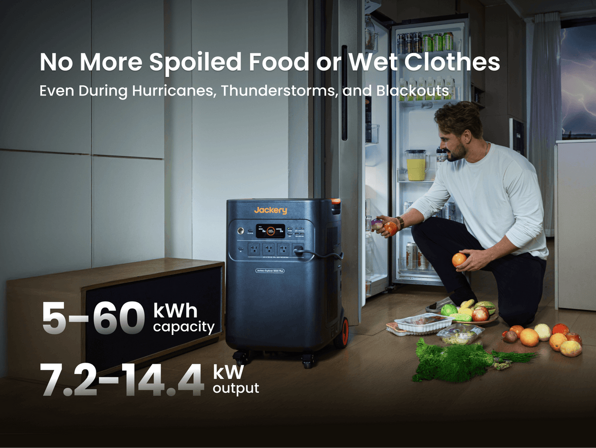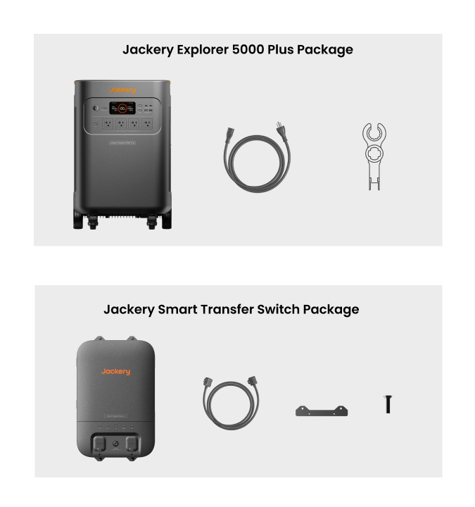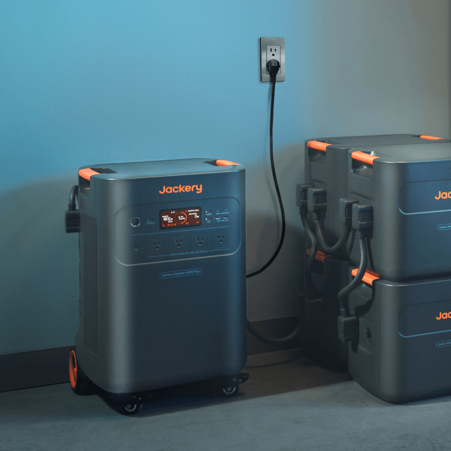 Jackery Explorer 5000 Plus offers eco-friendly home backup with 5-60kWh capacity and dual voltage output (120V/240V). It can power your essential deivces during outages with 12 output ports, 7200-14400W output, and a 0ms UPS seamless switchover for essential devices like fridges, computers, and routers. Connecting your essential circuits via the Smart Transfer Switch will also allow you to power your rooms seamlessly during an emergency. Smart app control and multiple charging options add convenience, while its zero-emission design ensures safe indoor use.