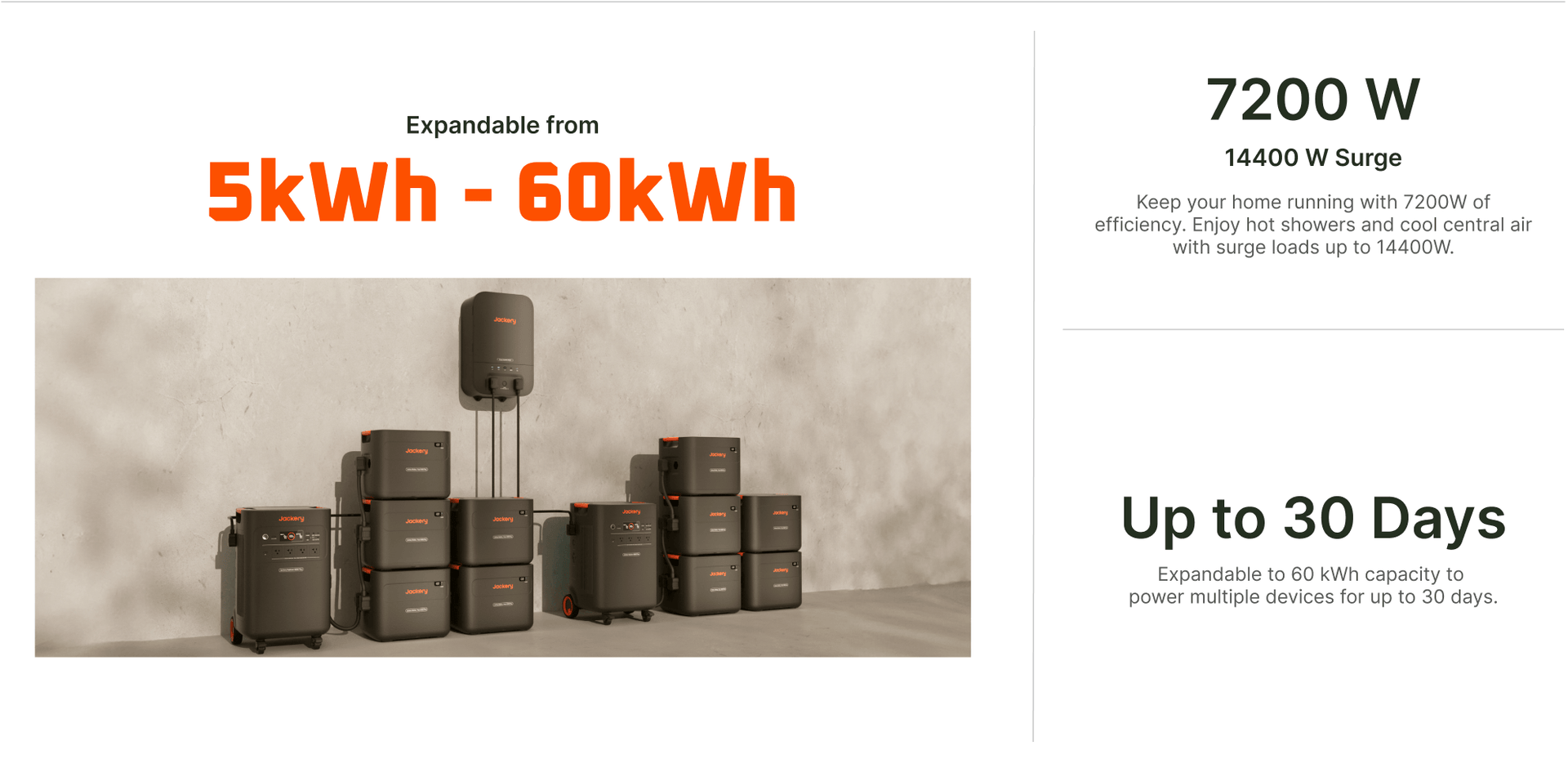 The Jackery E5000 Plus is expandable, offering an initial 5kWh. Connecting one 5000 Plus unit with a E5000 Plus Battery Pack provides 10kWh, expandable up to 5 Battery Packs for a total of 30kWh. With two E5000 Plus units and 10 Battery Packs, you can reach a maximum of 60kWh. Please look up the maximum capacity allowed in your jurisdiction prior to ordering.