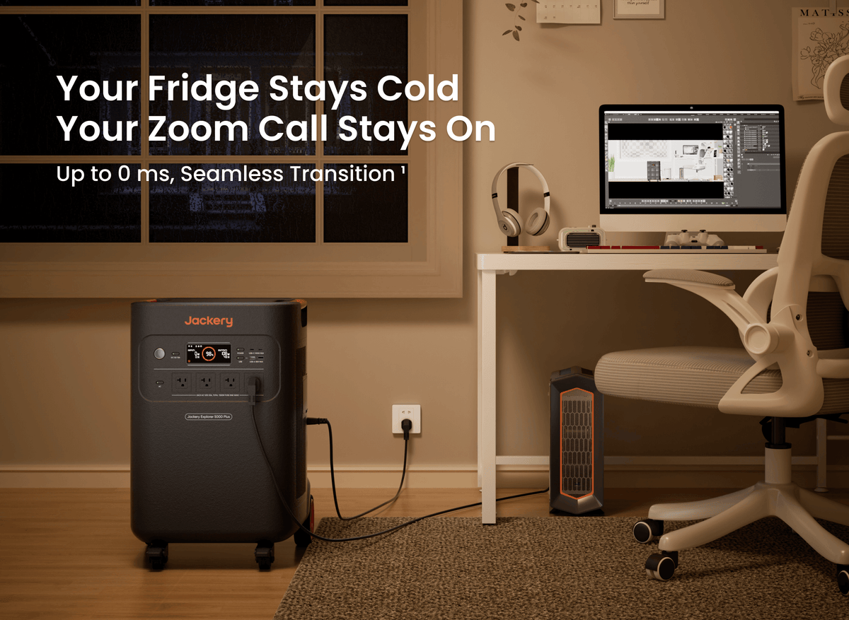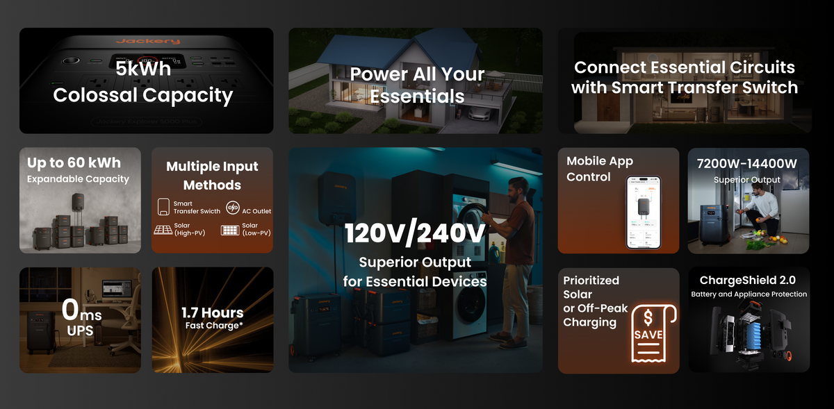 Jackery Explorer 5000 Plus offers eco-friendly home backup with 5-60kWh capacity and dual voltage output (120V/240V). It can power your essential deivces during outages with 12 output ports, 7200-14400W output, and a 0ms UPS seamless switchover for essential devices like fridges, computers, and routers. Connecting your essential circuits via the Smart Transfer Switch will also allow you to power your rooms seamlessly during an emergency. Smart app control and multiple charging options add convenience, while its zero-emission design ensures safe indoor use.