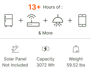 Delivers 3600W continouous output (up to 7200W surge) to handle refrigeration, lighting, router, and small appliances without circuit overloads.