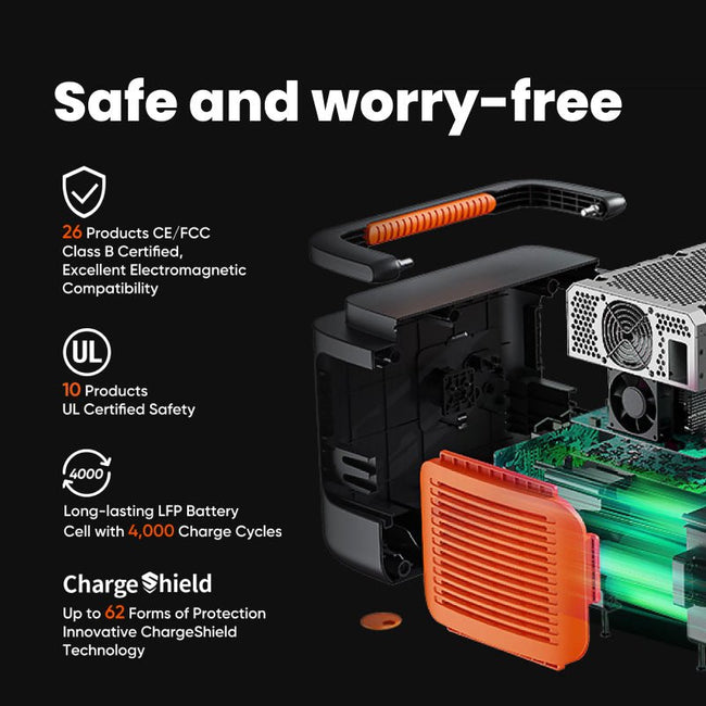 Experience advanced safety with the Solar Generator 2000 v2. Upgraded with ChargeShield 2.0, it supports fast, emergency, and whisper-quiet charging. Built for durability and emergency readiness, it offers 62 unique protection mechanisms, 12 BMS safeguards, and 4 forms of physical protection, ensuring comprehensive safety and peace of mind.