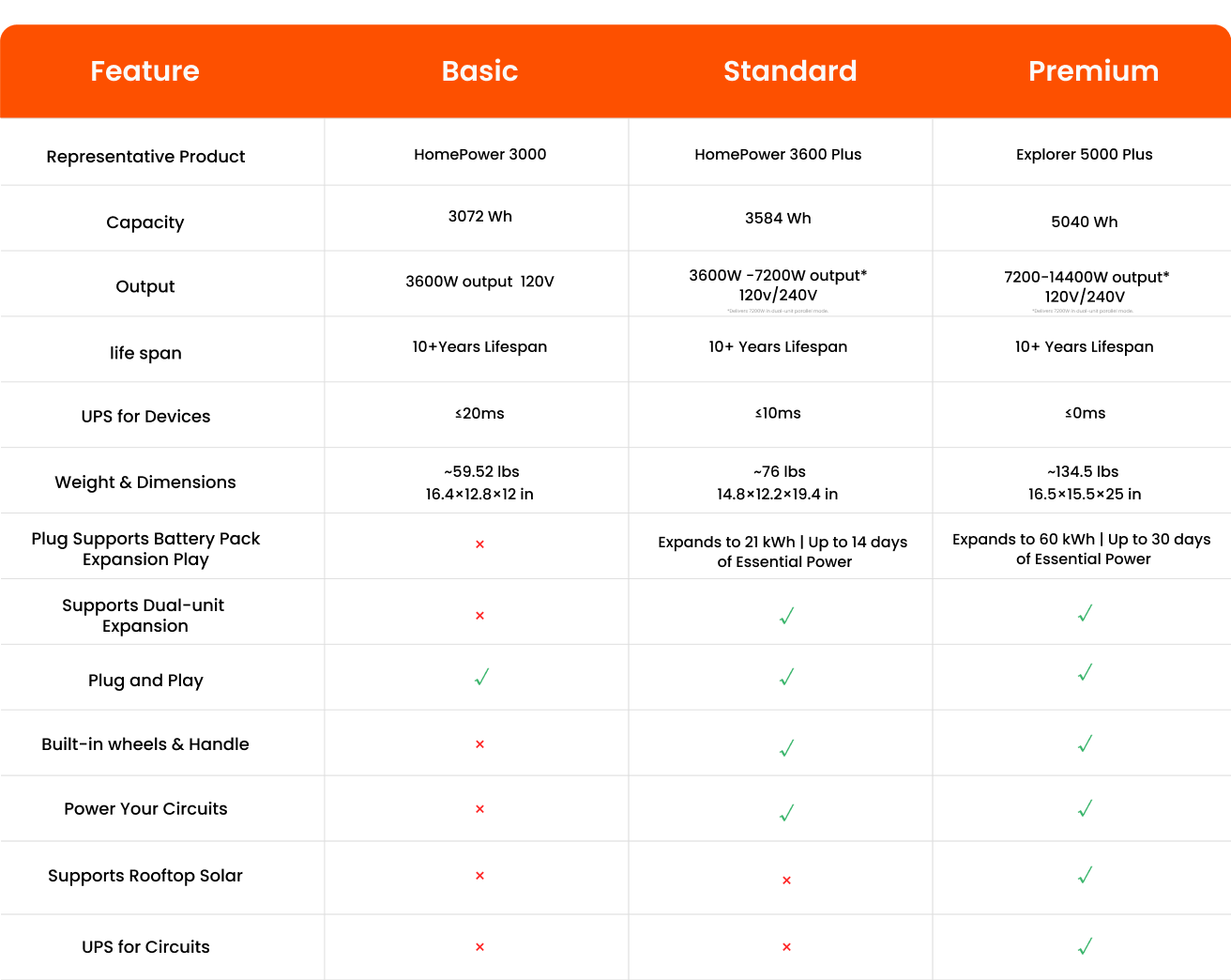 3600W/3584Wh with capacity expandable up to 21kWh, capable of powering a fridge for a family of 3 for up to 14 days. 3600W–7200W with 120/240V (in parallel) dual voltage, running high-demand appliances—fridge, water pump, and dryer all at once.