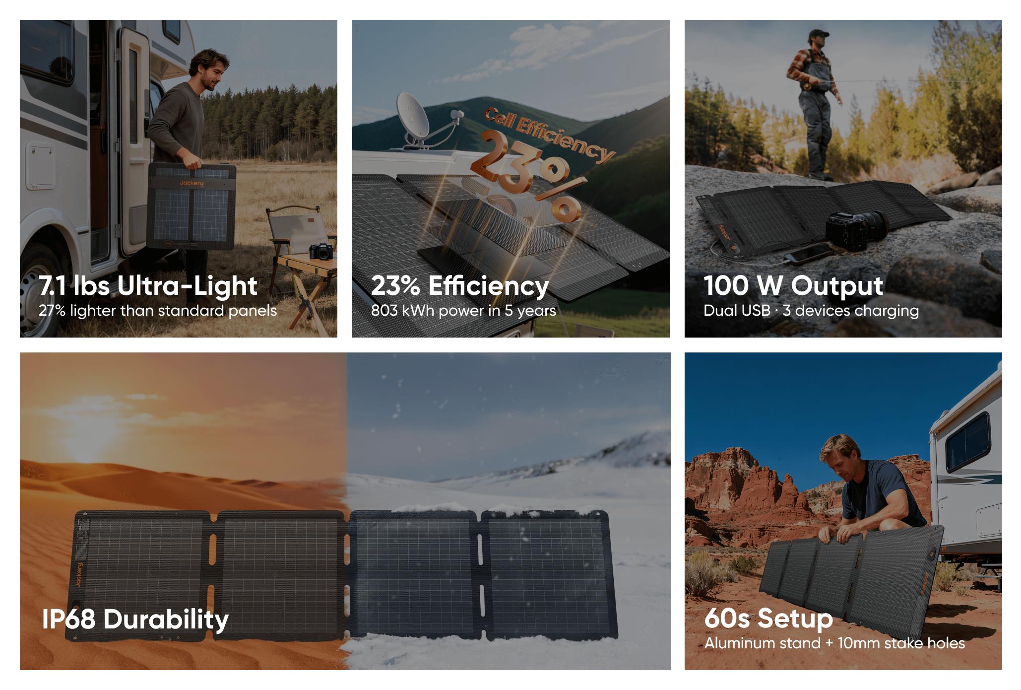 Build up your Portable-Solar-Generator System together with Jackery Solar Saga 100W and Jackery Explorer 240/300/500/1000/1500 power station (sold separately). Jackery solar generator is ideal for any outdoor activities such as camping, climbing, hiking, picnic and even unexpected power outages. It could run most of your essential outdoor appliances and electronics. When you need power in special circumstances, Jackery solar generator can also be your reliable backup power supply.