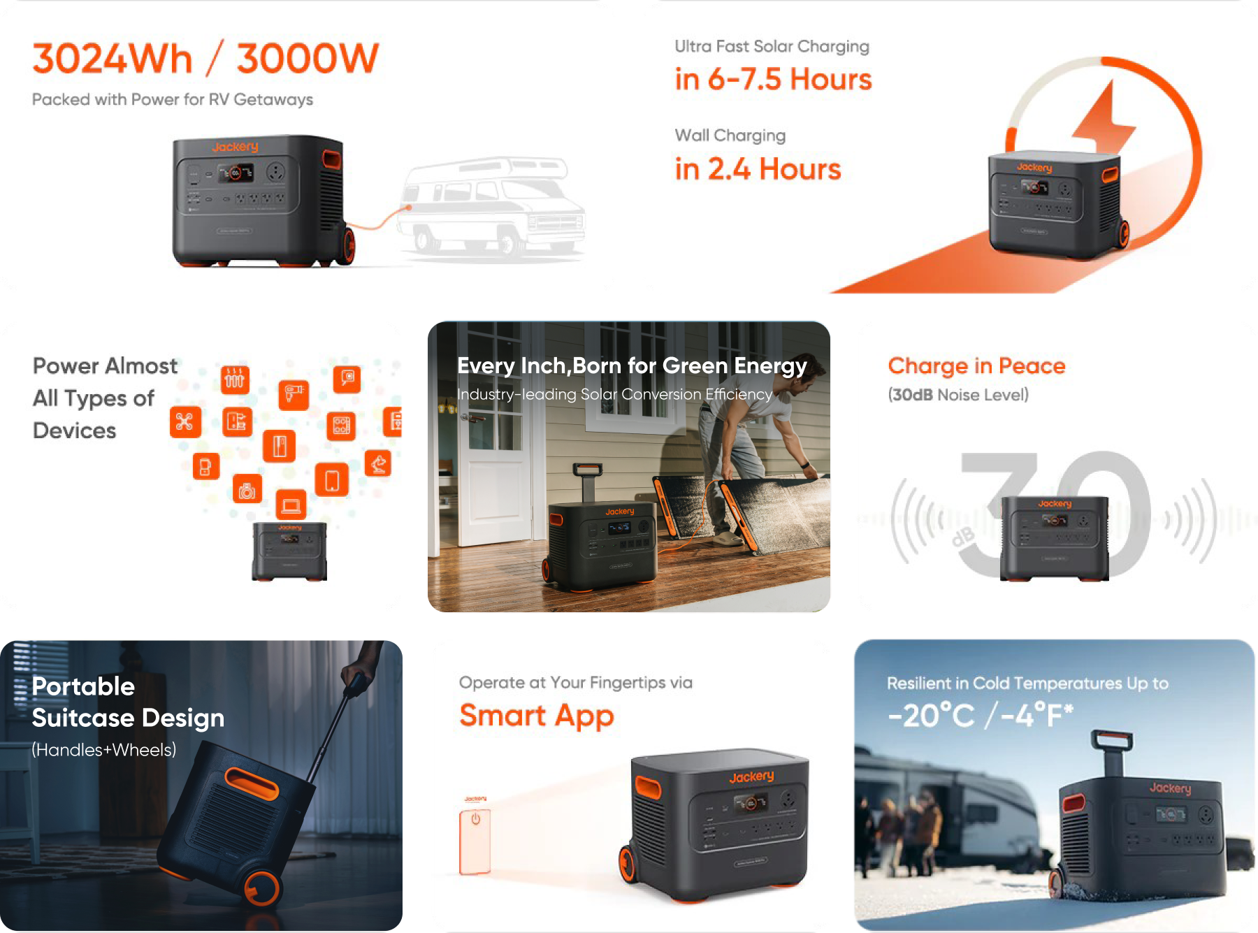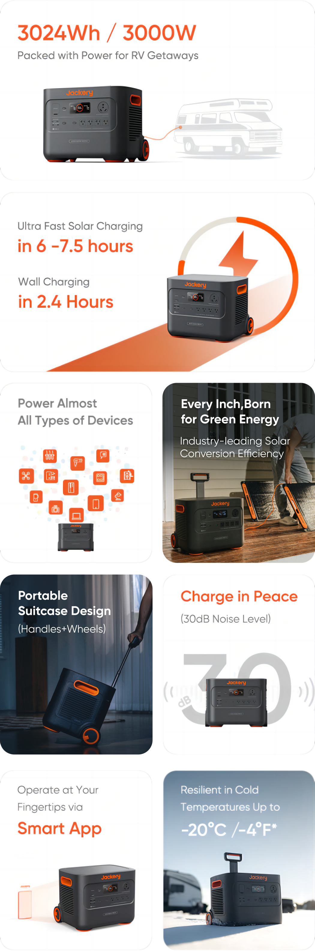 Jackery Solar Generator 3000 Pro is your SMART power master to cover all your electricity needs with a vast 3024Wh capacity and massive 3000W power output. The Explorer 3000 Pro power station can charge 99% of appliances for extended periods and supports app control, making it an ideal power for RVs, camping, glamping, or home emergencies.