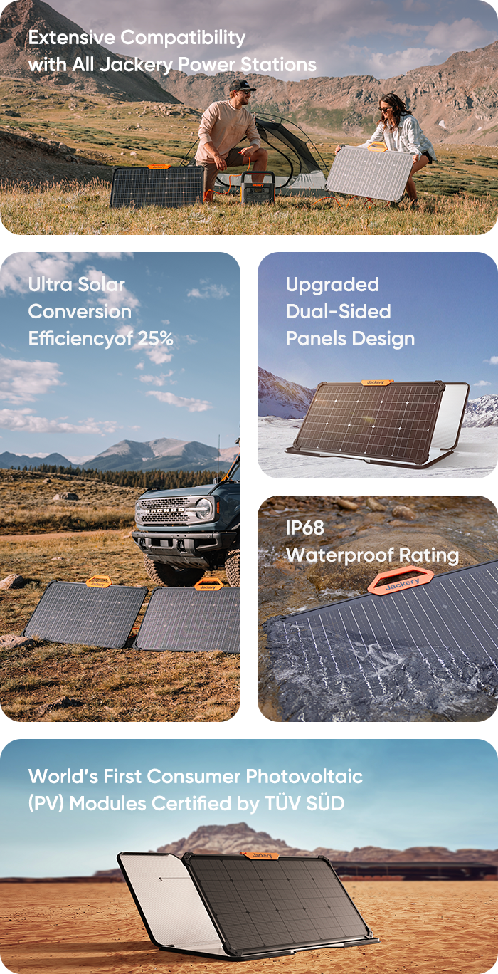 The 80W Solar Panels are fully compatible with all Jackery Power Stations, providing first-rate charging options with up to 12pcs of 80W solar panels charged at the same time. You can charge in any way you want.